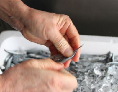 話を戻しますね。「魚食らべれる?」と、奥さまが、きんなごを慣れた手つきでおびいてくれました。