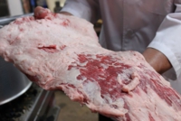 「肉の味は切り方で決まる」が持論のご主人は、機械は使わずに、肉の繊維を見ながら丁寧に切っていきます。そして、「食べなはれ」(食べなさい)と貴重なお肉を味見させてくださいました。