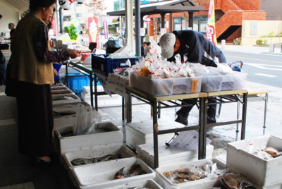 私が住んでいる厳原町では、毎週日曜の朝8時から「城下町朝市」が開かれており、対馬の生産者が直接新鮮な鮮魚や農産品、食品などを販売しています。地元産の美味しい食材が安価で手に入るとあって、町内の主婦から観光客まで多くの方が買いに来られます。