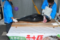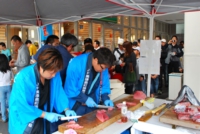 また、朝市ではないのですが、11月5日には正午から対馬で養殖されたマグロ解体ショーと試食会、美津島町根緒地区の漁師料理だった石焼料理の試食会が行われ、大勢の韓国人観光客や地元の方が行列をつくり、新鮮な対馬の食べ物に舌鼓を打っていました。(私も根尾地区の漁師さんのお宅で石焼料理をごちそうになったことがありますが、ニンニクなどを漬け込んだ自家製の醤油ダレで食べる新鮮な魚やイカ、野菜の石焼料理は絶品でした)