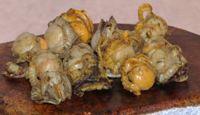 ※石焼料理・・・美津島町根緒地区の漁師達が浜辺で、焚き火の上に石英斑岩の薄い石を置き、新鮮な魚介類を焼いて食べていたものが広まり、対馬の郷土料理のひとつになりました。
