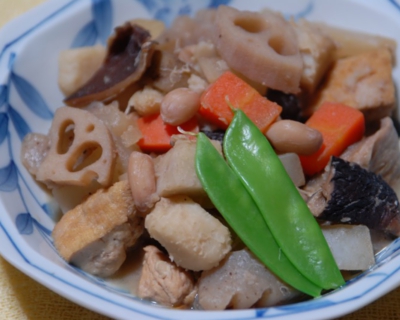 野菜は乱切りでも1.5cm角に切ってもOK。私は1.5cm角にそろえて切ったつもりが、バラバラに……。ごぼう・れんこんは酢水でアク抜きする、こんにゃくは湯通しなど、通常の煮物を作るのと同じように下ごしらえを。鶏肉と野菜を炒めた後、だし汁と、ここに落花生のゆで汁を入れて10分、アクをとりながら煮ます。だし汁も野菜と同じく、これというものが決まっていないようなので、私は干し椎茸の戻し汁を使いました。野菜が煮えたら砂糖、酒を加え、さらに10分煮て、最後にしょうゆを足して煮含めてください。