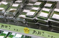海の幸では、オガミゼという貝が売られていました。私が子供の頃はカメノテと言って磯の岩の間に郡生していて採り放題でした。味噌汁に入れると良い出汁が出て磯の香りとともに楽しめます。次は海草のあおさ。こちらも子供の頃は磯にへばりついていたのを剥がして採っていましたが、近年は島内各所で養殖されています。こちらも味噌汁に入れると美味しい味と香りが楽しめます。