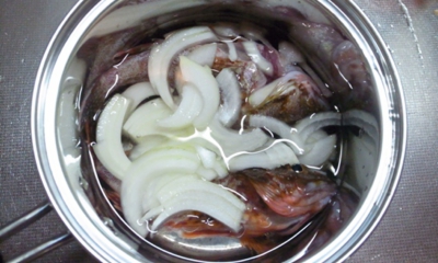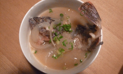 そんな訳で、アラカブの味噌汁。五島でも人気です。ソウルフードと言ってもいいかもしれません。作り方はカンタン。まず、近所の漁港でアラカブを釣ってきます。釣れなかったら、近所の魚屋さんで買ってきます。ウロコをとり、さばいたら、水を入れた鍋の中へまるごと(大きいアラカブのときは切り身にして)入れます。刻んだ玉ねぎもいれるといいです。水が沸騰してからではなく、水の状態から魚を入れること。それと、水の量を多くしすぎないことが、いいダシがでるポイントです。アラカブ全体に火が通ったら、火を止め、お味噌をといて、味見して、はい出来上がり。骨のまわりのトロっとした身をチュルっと食べるのが格別です。あ、小さいアラカブは小骨が多いので、くれぐれもご注意くださいね。
