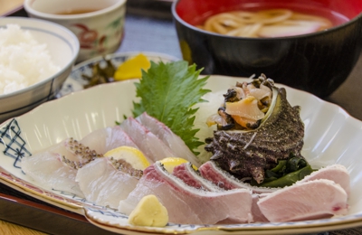 「刺身定食」(1,100円 小鉢、うどん、ごはん、漬物付)
