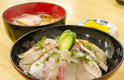 「おまかせ海鮮丼セット」(980円 うどん、漬物付)