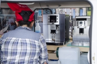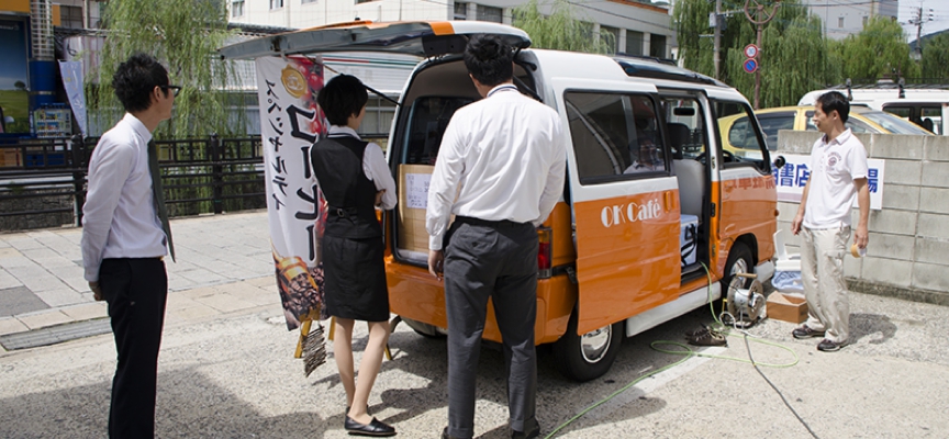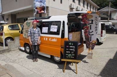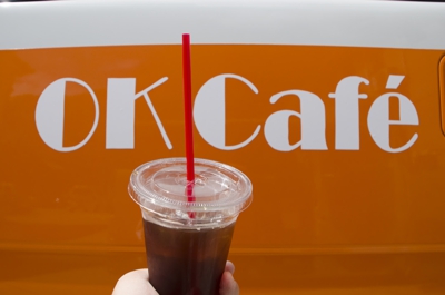 いつも行く本屋さんの駐車場に、美味しいコーヒーを販売している車がいるということで取材に伺いました。本日オープンしたばかりという「OK Cafe」。白とオレンジのツートンカラーの移動販売車では、近所の方たちが集まってきてコーヒーを購入していました。