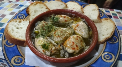 スペインのバル(居酒屋)での人気おつまみです。ワインとの相性が抜群ですけど、日本酒熱燗もなかなかイケテます。ただし、ものすごく熱くなるまで煮立てるので、専用のアヒージョ鍋じゃないと途中で割れる可能性大です。そこで、今この時期の瞬の食材と言えば「牡蠣」!「牡蠣」のアヒージョです。五島には、特産の石花(せっか)という小さい粒の岩牡蠣がありますが、アヒージョには不向きなので、大粒の久賀島産の牡蠣です。