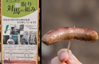 まずは私も初めて食べる、島内で解体処理された猪のソーセージ。炭火で焼き立てを頂きましたが、これが肉々しいジューシーなソーセージで、とっても美味しかったです。牛や豚と違い猪や鹿は、と畜場法の対象では無いため、対馬市独自の衛生管理ラインと食品衛生法に則って加工されていると説明されていました。島内での安全な処理で安心して頂けますね。