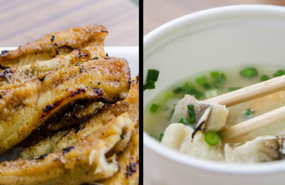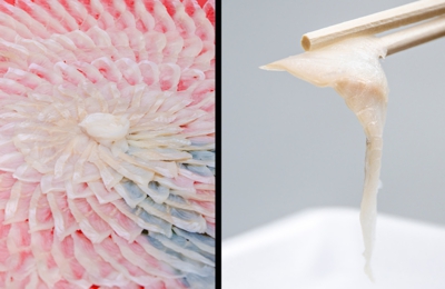 次に頂いたのは、なんとアナゴの薄造り。アナゴはウナギと同じで、血液や粘膜にたんぱく毒をもっているので本来は加熱しないと食べませんが、今回は食通祭ということで提供されていました。薄く引かれた身は透明感のある白身で、適度な食感と旨味を感じました。