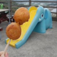 じゃがいもの大きさは卵ぐらい。ほんのりと甘い衣をまとったじゃがいもを、カラリと揚げています。衣のカリッと感、じゃがいものほくほくがたまらんのよ。ただし、串からじゃがちゃんが落下する危険大なので、食べるときはご注意あれ。