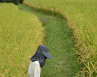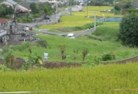 高台から、小島田地区の全景が見られました。手前から、だいたい稲・墓・稲・家。かかしのおかげか、カラスは上空を飛び回ることはあっても、一羽たりとも田んぼに近づけず。ブラボー、かかし隊!! 島原半島の方に聞きましたが、今年は、台風などの天候不順で、稲刈りの時期も例年より1週間ぐらい遅いそうです。