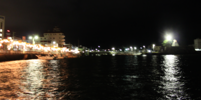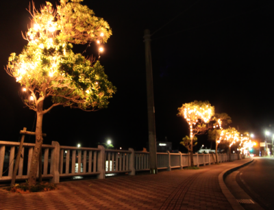 細道がテーマということで、私の散歩道を紹介します。私は、お日様の下の散歩よりも、月明かりの下での散歩が好きです。今夜は月明かりではなく、ライトアップされている福江港沿いの道を歩いてみました。