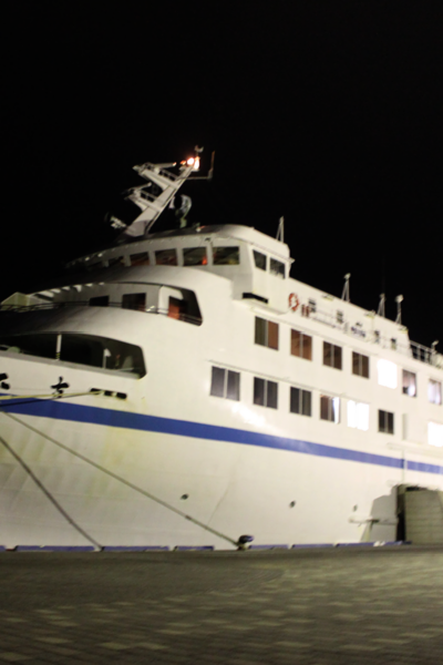 桟橋が揺れる音だけが響いていました。昼間は、見送りお迎えで賑わっているこの場所も、夜は静かに佇んでいました。また明日、いろんな物語がここから始まるのでしょうね。ターミナルを通り越して、少し先に歩いて行くと、フェリー乗り場があります。私が行った時は、五島と博多を繋ぐ「太古」が停泊していました。「太古」は、五島福江→奈留→若松→青方→小値賀→宇久→博多と色んな島へと人々を繋いでくれます。空の旅ももちろん魅力的ですが、船の旅もゆっくり流れる時間を楽しめて素敵ですよ。