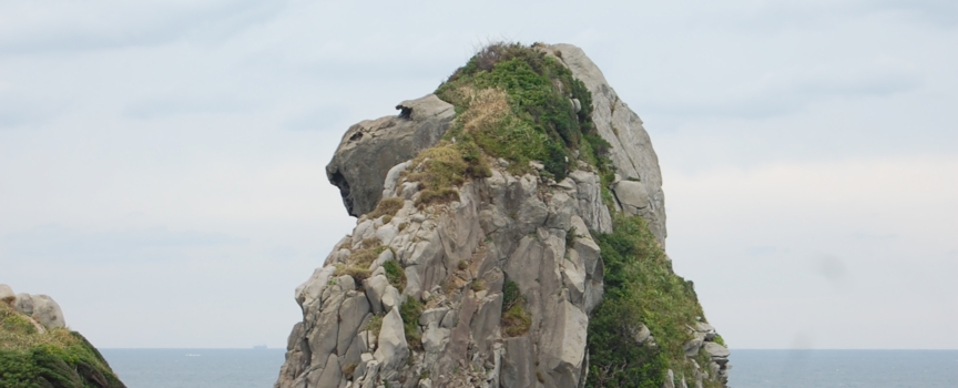 島の細道第2弾は、壱岐の代表的な観光地猿岩周辺をご紹介します。壱岐の西の端、黒崎半島の先端にある通称「猿岩」は、そっぽを向いた猿の姿の奇岩です。その高さは45m。海蝕崖の玄武岩でできていて、壱岐にある八本の柱の一つ「折柱」といわれています。今では壱岐の有名な観光地ですが、以前は壱岐の人も知らなかった場所なんですよ。