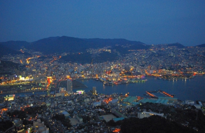 ロープウェーを降りて最後に目指したのは展望台です。ここも観光客でいっぱい。ちょうど日が暮れたばかりの時間帯で街に明かりがポツポツと灯り始めていました。やっぱりきれいですね、長崎の夜景。
