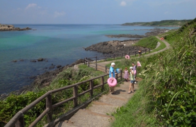 バンガローのある岬からは、海沿いに遊歩道も整備されていて、この道をてくてく歩いていくと、浜田海水浴場という砂浜にたどりつきます。岩肌がつづくこのあたりの海岸に、突然あらわれる小さな砂浜。いつ行ってもプライベートビーチ感覚で楽しめます。