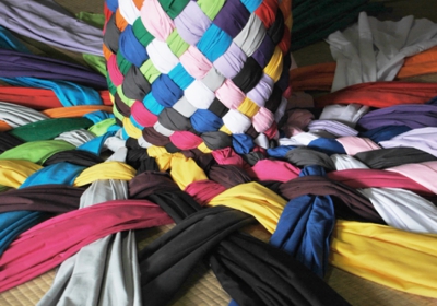 タンシムチュルとは韓国の伝統的な時節遊びで、大勢の人が協力し1本の柱に色とりどりの布を編んでいくもの。この作品はそれを応用したアートで、対馬の地で韓国や日本の学生、市民が参加し制作されたものです。