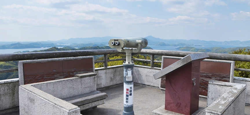 展望台からの景色は、複雑な溺れ谷、浅茅湾(あそうわん)を360度ぐるりと見渡すことが出来、この日は春がすみで遠くがかすんでいますが、案内板によると天気の条件が良ければ、北東方向に韓国釜山の山並みが見えるとあります。