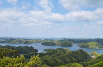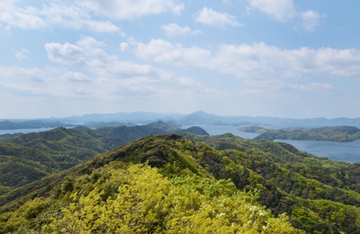 眼下には新緑の山々、白い波をたてて走る漁船、養殖のブイ、のどかな漁村などの景観が広がっていますね。対馬の中央部からこうしてぐるっと眺めると、改めて対馬の大きさを実感しました。