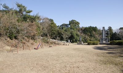 公園の一角には、三つの石碑が並んでいます。一番大きな石碑は「忠霊塔」とあります。説明看板など無いため詳しくはわかりませんが、このような軍用墓地は平時の軍人を埋葬する目的で作られ、後に戦争で命を落とした戦没者も祀られるようになったようです。立派な石碑ですが、残念ながらところどころ欠けたり、敷石が割れていました。