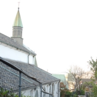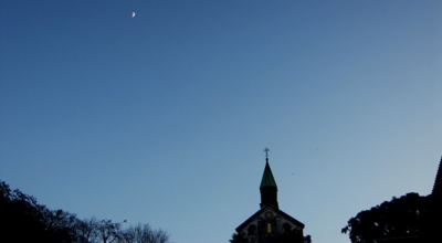 大浦天主堂に着きました。ふと空を見上げたら、お月さまが。ほんわか気分に浸りながら、本日のプチ歩きは終了です。