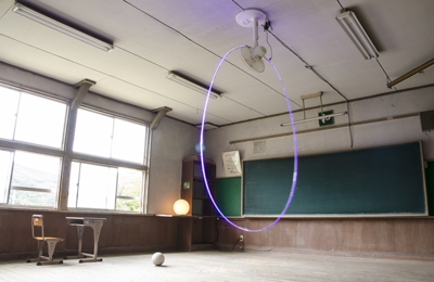 次は様々な素材を使い扇風機で動きをつけたアート作品が多い黒田大祐さんの「幻日」(LED・運動場)幻日(げんじつ)とは、太陽の横に現れる大気現象のこと。窓側に置かれている椅子に座って外の景色と教室内の作品を見ることで幻の太陽を表現しています。運動場の楕円形と対をなすLEDの輪は扇風機で動きながら、色が変化していました。
