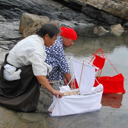 住民のみなさんは多久頭魂神社内の観音堂に集まり、2枚の板船の両舷にその場で削った竹ヒゴを立て、それぞれの船に赤と白の布を巻きつけた紅白2艘の船を完成させ、浴衣やはかまに着替え疫病除けや海上航海安全の祈りをささげました。その後、白船を担いだ宮司さんを先頭に太鼓やドラ、笛を鳴らしながら豆酘の海岸まで練り歩きました。(カンカン祭りの名称は、この鳴り物を鳴らす様子から付けられたそうです)観音堂から約1.5kmの海岸では、紅白2艘の船を海に浮かべ、近くの小松崎神社へ奉納しました。