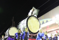お祭りを最高に盛り上げてくれるお囃子隊。9月からほぼ毎日、学校帰り、部活帰りに文化会館音楽室に集まり、練習していたそうです。この期間は、大人よりもハードな生活だったと思います。大変だったけど、その頑張りも報われてるよね!すっごく素敵!その子どもたちの練習に付き添って教えてくれていた先生たちも今夜は、花形。大きな太鼓の上に乗って、迫力の演技!