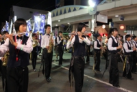 街中もたくさんの人で賑わってきた頃、夜の部スタートです。五島ハイヤ・ソーランからスタートし、ブルースカイ五島のフラダンスのパレードが行われました。19時になり、ねぶたが、丸木地区の倉庫から出発したと町中にアナウンスが流れます。