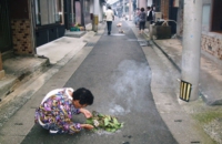 八幡青年団を中心に、「浜カズラ」と呼ばれる植物の蔓を集め、編みあげた約10メートルの長さの綱を、地域の子どもから大人まで約100人が一緒になって、通りを練り歩きます。13・14日は、西方浄土からの先祖の霊を迎えるため、八幡浦を西から東から西へカズラを曳き、15日は東から西へカズラを曳き、先祖を見送ります。
