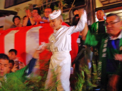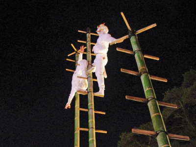 フラッシュを切って見る側も準備万端。狐のお出ましを待ち構えているとトップバッターの子狐さんが登場してきました。なんと幼稚園に通っているかわいい子狐さん。演技するのは子狐用の小竹ですが、それでもその高さは約5メートル。大人の私でも怖いだろうなぁと感じる高さでしたが立派に演技してくれました。