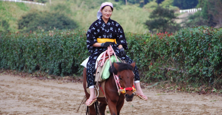 対馬では昔から旧暦6月の午の日に「初午祭」という祭事が行われていました。これは2~3歳の男児を馬に乗せ健やかな成長を願うことと五穀豊穣を祈るもので、そのときの余興として各家庭で飼育されていた対州馬を競わせる競馬「馬跳ばせ」も各地で行われていました。