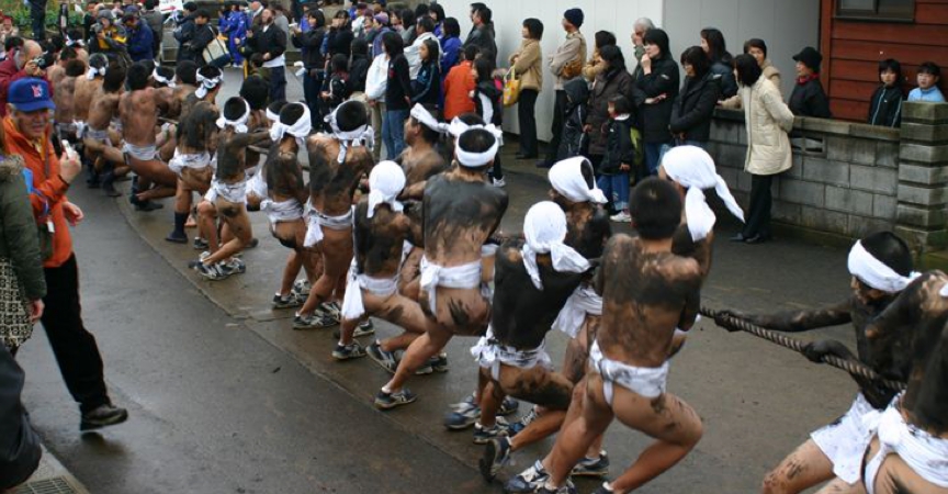 羽つきが終わると、砂浜の海岸で、地元の青年団と消防団に別れて、豊作と大漁をかけ、直径40センチのワラ玉を奪い合う玉けりと、綱引きが行われます。この時、ふんどし姿の若者達は体中に「ヘグラ」と呼ばれる鍋墨(スス)を塗りつけていて、体中が真っ黒。この「ヘグラ」を見物客にも塗り回ります。
