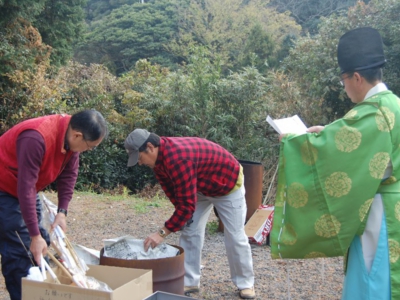 有難いお札の処分をどうしていいかわからなかったのですが、このようにきちんとお祓いをして処分する祭事がきちんと行われていたのですね。神事の後も総代は神社の周りの掃除と、新年を迎える準備をしていました。12月31日の大晦日午後10時~「かがり火」を焚き、御神酒を振る舞う年越し行事もありました。また、1月1日~3日の初詣参拝者を迎える行事や、1月14日の鏡開きも総代の仕事です。
