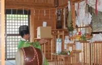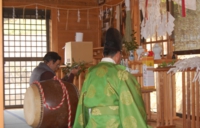 神主さんもきれいな萌黄色の装束で登場され、祝詞をあげ、うやうやしくお祓いをされました。この一年を振り返り、氏神さまに感謝するとともに、新年を新しい気持ちで迎えられるよう、氏子を代表して、総代5名と相談役1名が参加していました。