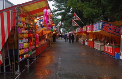 さて、今年の初市は3月3日から3月11日まで開催されています。私が出かけた日はあいにくの雨…。しかし、会場の「霊丘公園」の駐車場に車を停め石段をのぼると…。