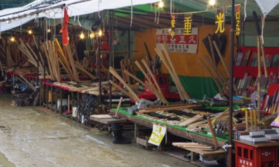 こんなにたくさんの露店が並んでいました~。雨でジュクジュクの道を、そろりそろりとゆっくり歩き各店をチェック。タコ焼きや焼き鳥、いろいろな店が並んでいますね。