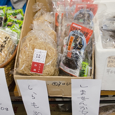加工品のコーナーでは海草のしらもが販売されていました。島内ではあえものやサラダ、刺身のけんとして使われています。あまりメジャーな食べ物ではないので、若い方は知らない食材かも知れませんが、このような食通祭では色々と見ることができて楽しいですね。