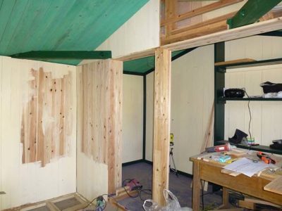 まずは、ボロボロになっていた壁などの補強から。徐々にスッキリしてきました。 天井や梁、柱などはグリーンでペインティング。