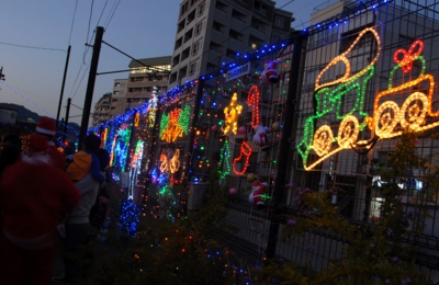 ホントに、運良く私が行った時からイルミのライトアップがスタートするということで、賑々しくイベントが行われていました。場所は石橋電停近くの松が枝公園。