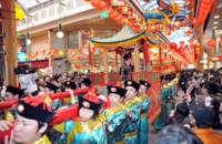 龍踊りや中国雑技など、様々なイベントが行われますが、特におさえておきたいイベントは2つ。皇帝パレードと媽祖行列です。写真の皇帝パレードは、清朝時代の皇帝と皇后が揃って街に出かけて、民衆とともに新年を祝う様子をイメージしたもの。皇帝と皇后のみこしに、旗隊など総勢150名の絢爛豪華なパレードは圧巻です。