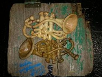 実は私も宮脇ちんさんの作品を持っています。どうですか! ンーん。アバンギャルド!彼は何を隠そう(別に隠してもいませんがね)私の音楽仲間で、宮脇ちんさんがギター、私が三線で「九弦(きゅうづる)」というデュオを組んでライブなどを演っているんです。そのご縁でこんな素敵な作品をいただきました。私の宝物です。