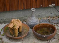 飾りつけの方法を説明しています。本職の陶芸の方は20代の初めから、関西の陶芸家の方に内弟子として指導を受けて、独立してからは五島に窯を作り、主に生活雑器を焼いて、福岡の画廊などで個展を開いたりしています。 雑器以外にももちろん創作陶器を焼いています。