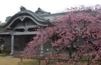 堂々たる緋寒桜と鍋島邸の主屋。緋寒桜は、2月中旬から3月にかけて咲きます。広い庭園には、芍薬やヤマボウシ、藤棚もあり、春夏秋冬それぞれのお楽しみが。