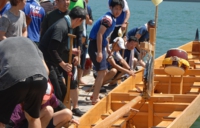 ペーロン船を各チームが保有しているのではなく、長与町が貸出しているようです。船尾の長与町章が眩しい☆ 選手たちが、用意された船に乗り込んでいました。ちなみに、ペーロンの語源は、中国の白龍(パイロン)だといわれています。福建地方の競渡船がルーツらしい。船の形や装飾など、時代を経て、長崎独自のものになっていきました。360年前から行われていたというから、なかなか歴史も古いんですよ。今では、長崎県の各地で、夏になるとペーロン大会が行われるように。いわば、長崎の夏の風物詩なんです!