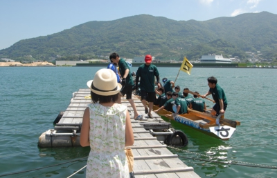 スタート! 今大会のコースは全長1150メートル。遠くに見える防波堤近くのブイをターンして、スタート地点まで戻ります。これだけの距離を5分ちょいで返ってくるってすごいなー。長崎の若者たちは逞しい!