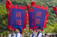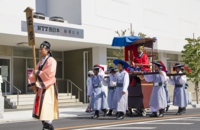 対馬藩主の居城、金石城跡の櫓門(やぐらもん)を出発した一行は、厳原港までの1.6kmの道のりを歩きましたが、この日の気温は30度を超える猛暑日。行列に参加した皆さんは大変だったことでしょう。