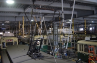 会場の浦上車庫は、当然ながら日常使いの車庫なので、何台もの電車が並んでいました。上からも眺められるような通路があったので、のぼってみると――圧巻!! 中央の黒い部分はビューゲルといわれる架線から直流600ボルトの電気を受け取る装置だそうです。
