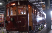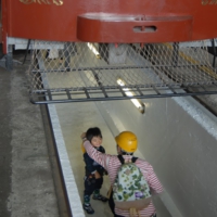 1911年(明治44)に作られた日本最古の木造ボギー車・168号。特別に、ヘルメットをかぶって下からも眺められるようになっていました。お子さんのテンションUP、恐らく理数系パパのボルテージもUP。お子さんにむかって熱弁する姿がかっこ良かったです。お子さんも嬉しそう!